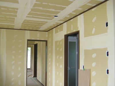 石膏ボードの継ぎ目やビス部分にパテを塗っています。