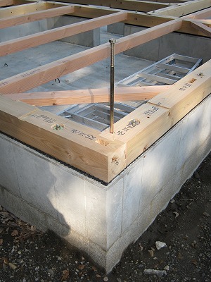 土台敷き:基礎の上に土台を並べアンカーボルトで固定します。