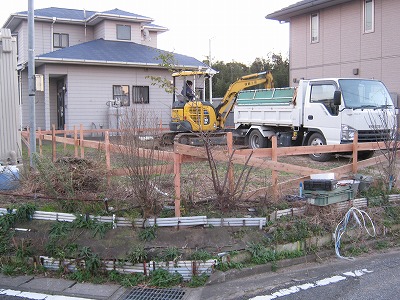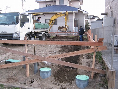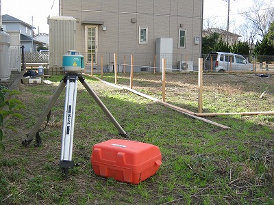 建物の外周部から、約50~100センチ程離した所に木杭を打ち込みます。