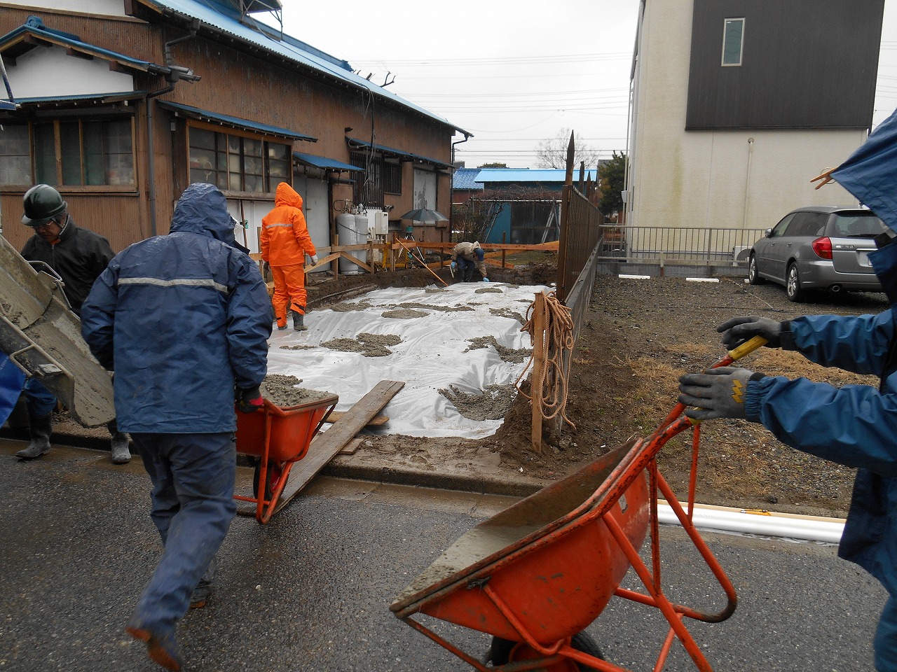 あいにくのお天気で、寒さも厳しい中、職人さんが生コンを打って下さいました。